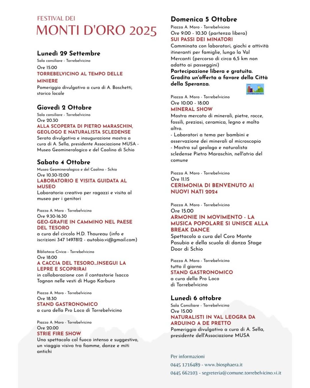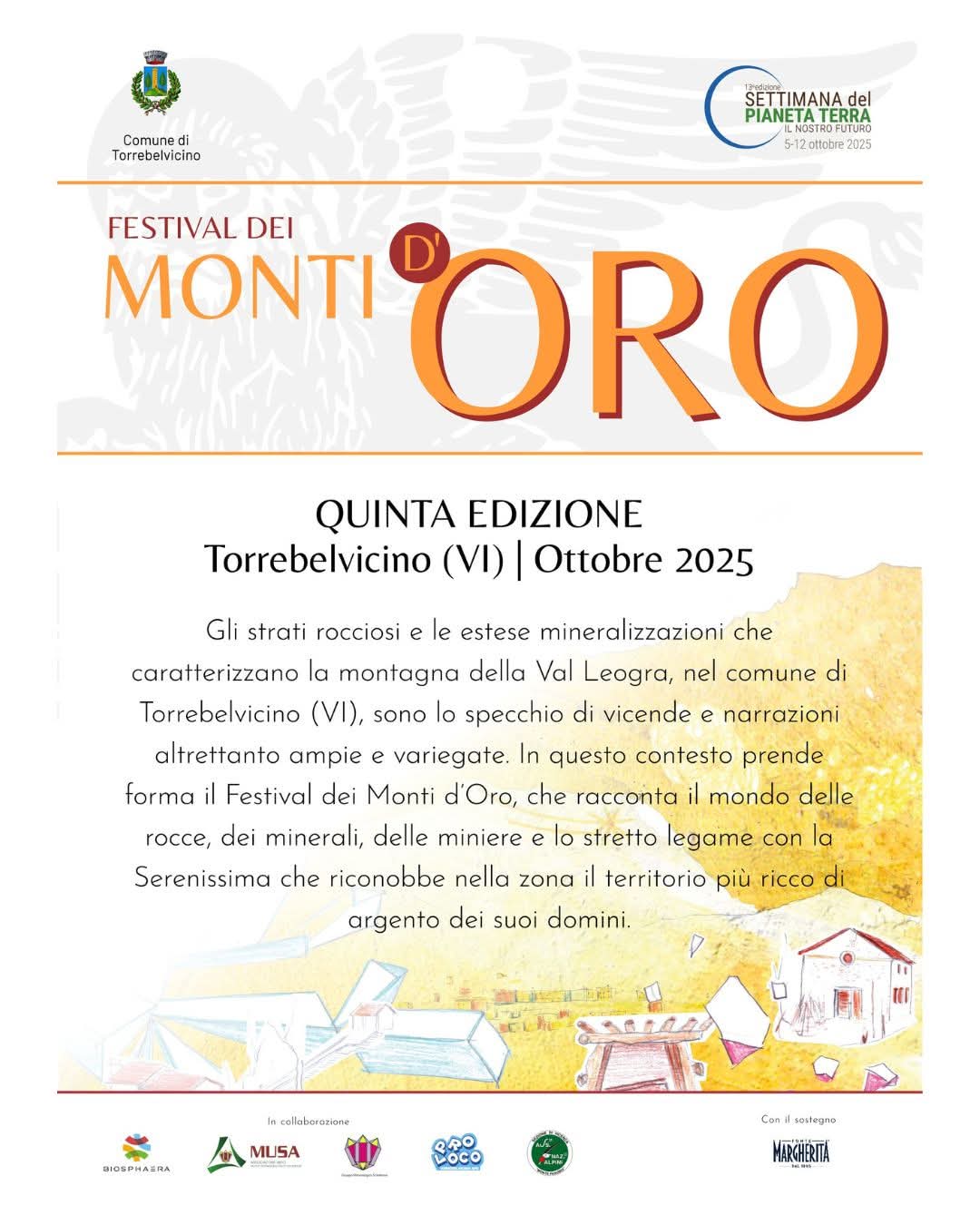Una settimana di eventi, conferenze, passeggiate, laboratori, mercatini, gastronomia, mostre: dal 29 settembre al 6 ottobre, Torrebelvicino ripropone il Festival dei Monti d’Oro, una manifestazione unica e immersiva per tutti. Obiettivo del Festival, è quello di far conoscere la storia di questa area montana conosciuta fin dall’antichità per la sua ricchezza mineralogica e per questo denominata “Monti D’Oro”.